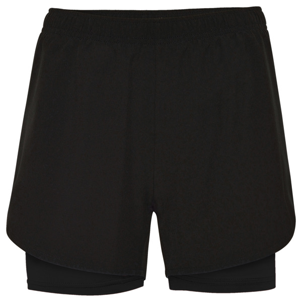 Women's sports shorts with contrasting inner short leggings. Elastic waistband with crossed inner drawcord for easy adjustment. High-visibility detail. Body fitting and special elastic fabric for running.