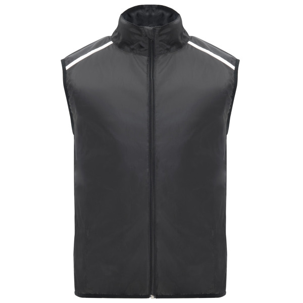 Viegla tehniska veste skriešanai.1. Priekšpusē pieskaņots rāvējslēdzējs ar zoda aizsargu.2. Elastīga apakšējās daļas un piedurkņu apdare.3. Aizmugures apakšējā daļa no mikroperforēta auduma.4. Atstarojošās detaļas augšā, priekšā un aizmugurē.5. Maisiņš, kurā ielikt vesti un ko var uzvilkt uz rokas.
