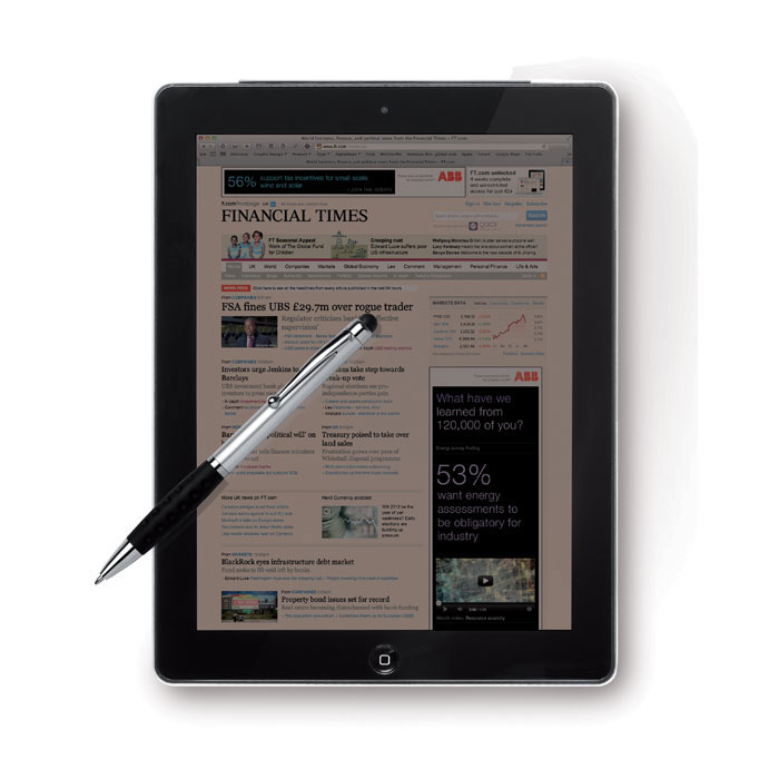 Stylus twist action ball pen in ABS with metallic finish and soft grip. Blue ink.