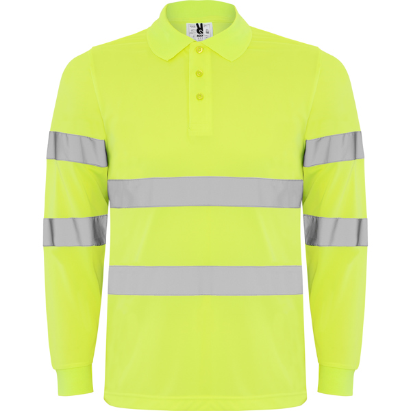 Augstas redzamības polo krekls ar garām piedurknēm un trim pogām.· 1x1 strīpains kakls un aproces. · Divas horizontālās atstarojošās līnijas vidū un uz piedurknēm. · Anti-skrāpējams audums.